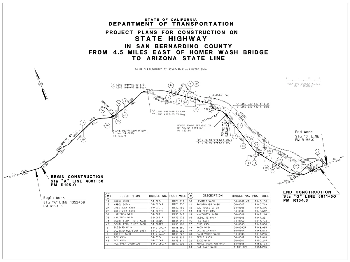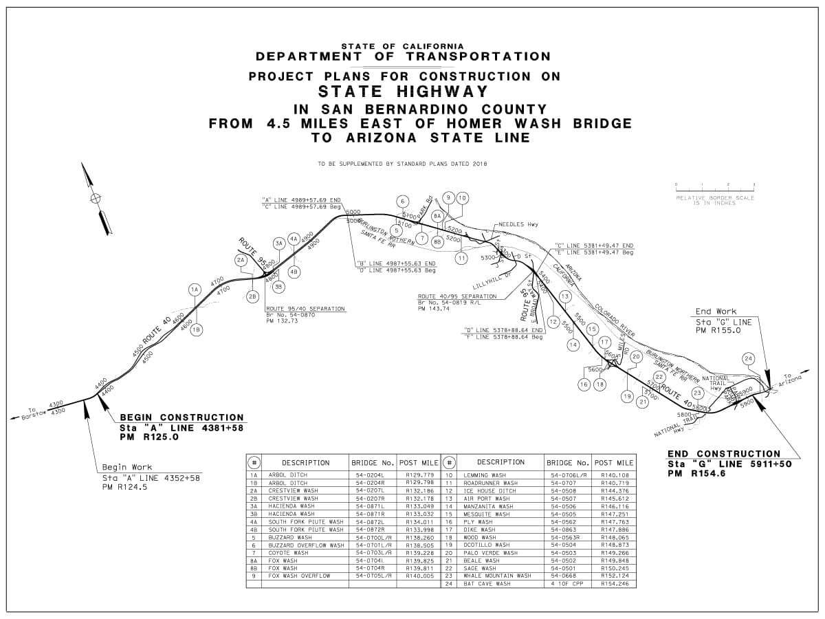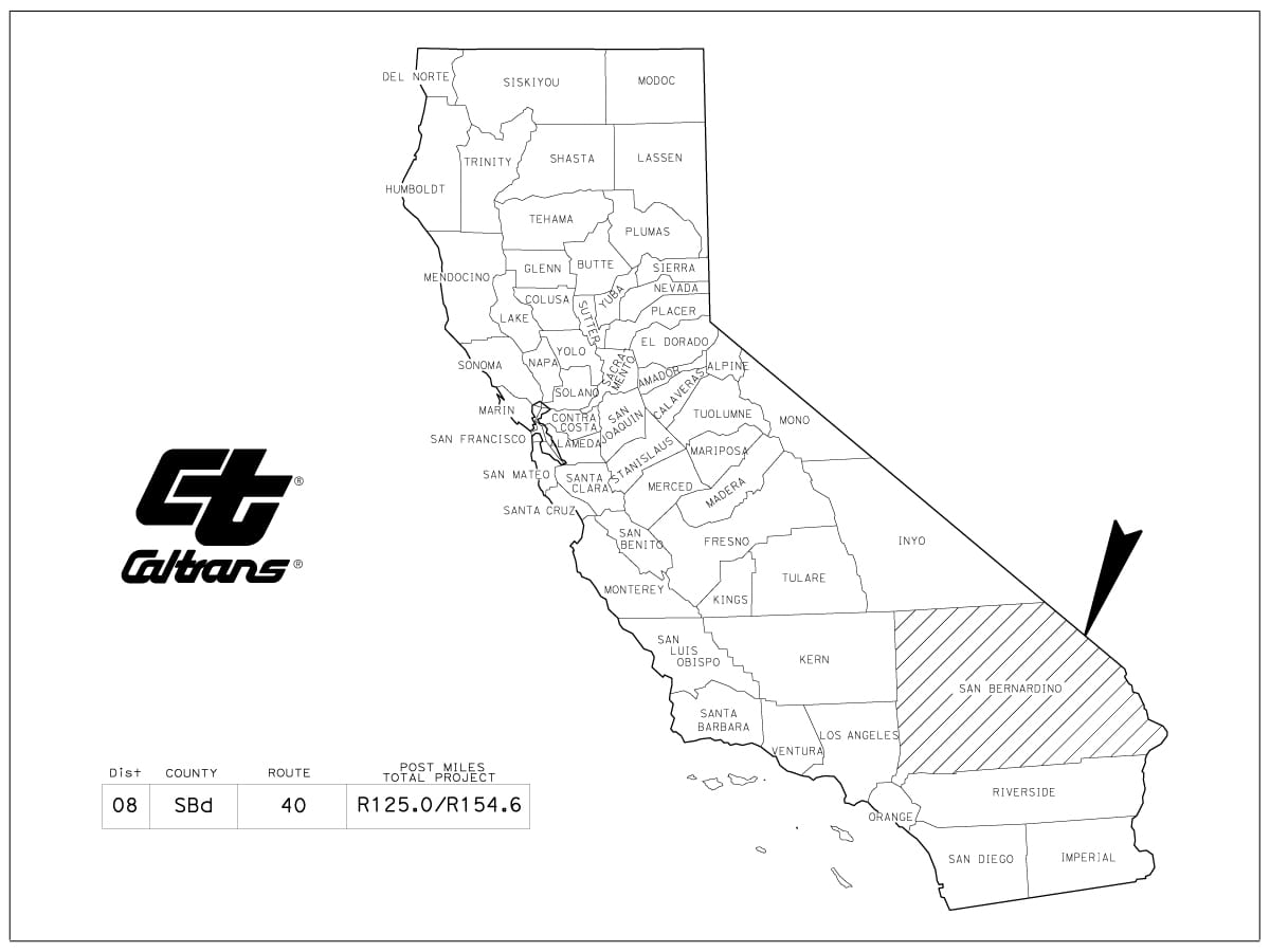 The California Department of Transportation (Caltrans) undertook the I-40 Median Infill project to address a significant safety hazard along a 29.6-mile stretch of Interstate 40 in rural San Bernardino County. The project corridor ran from approximately 4.5 miles east of Homer Wash bridge near the Town of Ludlow (Post Mile R125.0) westward to the California/Arizona State Line (Post Mile R154.6) — a remote stretch of high desert southeast near the City of Needles.