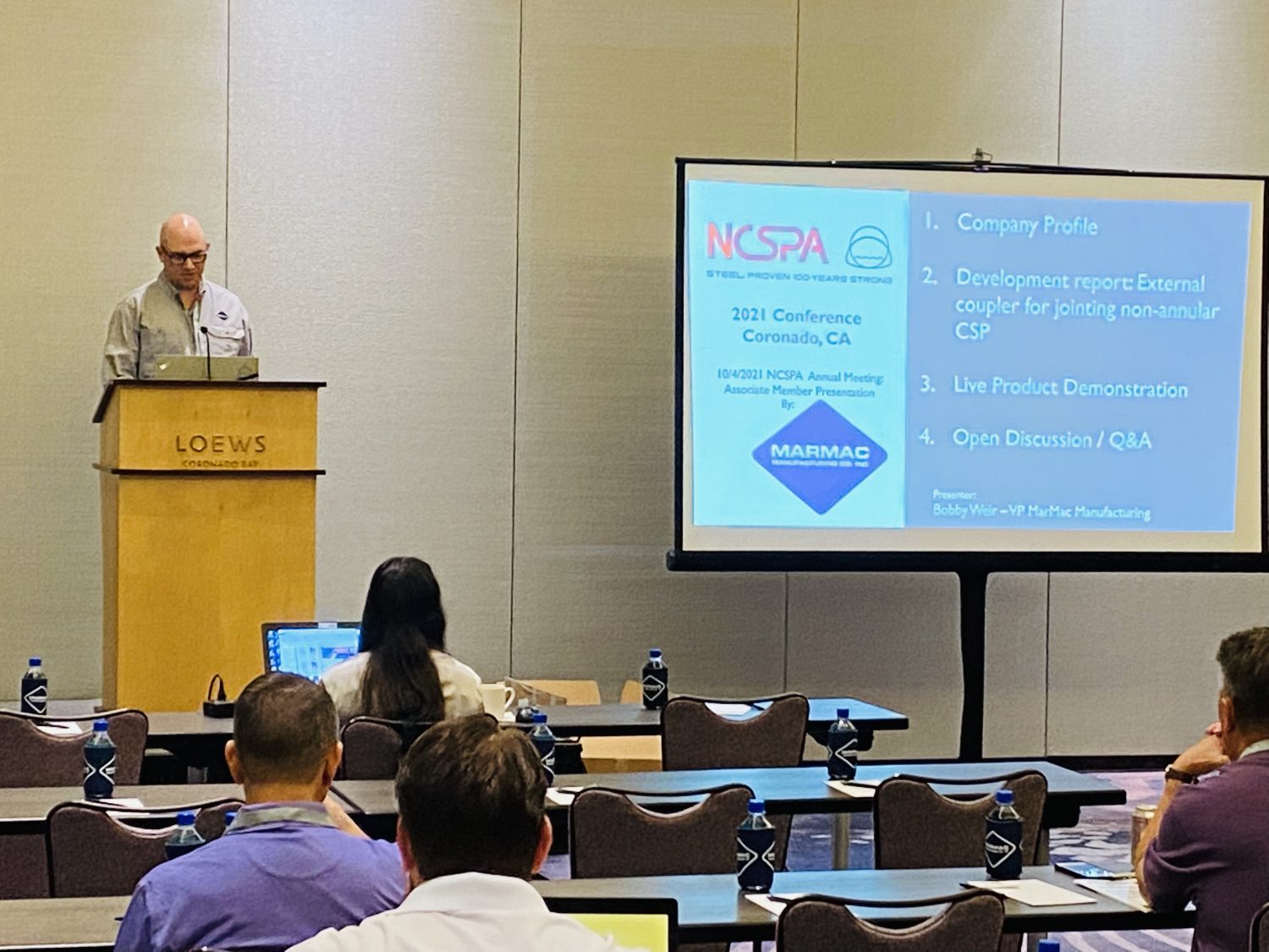 Robert Weir, Jr. speaking at the 65th Annual NCSPA meeting. He spoke about background of MarMac, provided a development report, gave a live product demonstration, and interacted with attendees through a Q&A session.
